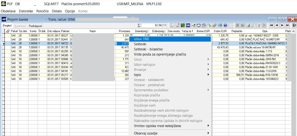 Aktivne opcije desnega menija pregleda knjiženih izpiskov so:- Izbor TRR- Seštevki- Seštevki - bilančni - Vrste posla za opremljanje plačila- Izpis- Vrnitev knjiženega izpiska med neknjižene- Obarvaj ozadje- Vrnitev izpiska med neknjižene