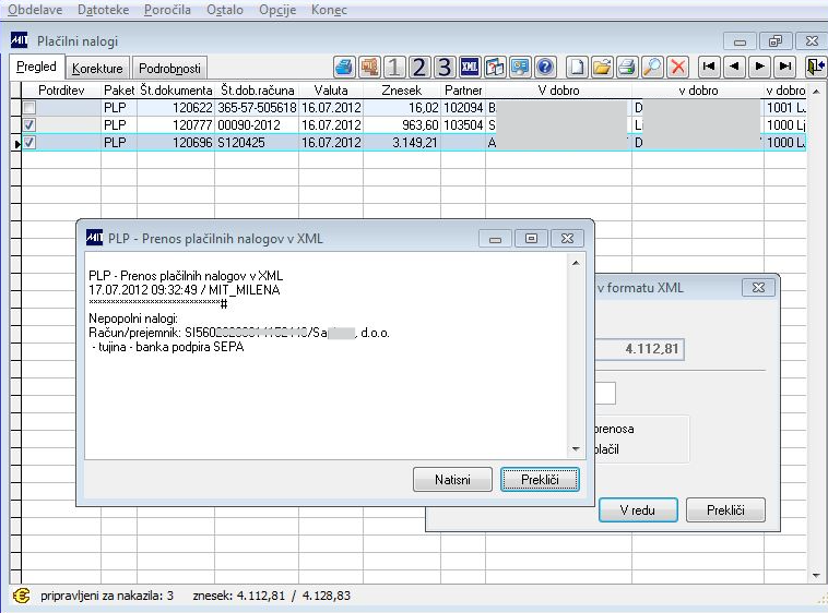 Pri pripravi XML datoteke izvajamo kontrolo na podatek o:- Kodi namena - šifra je obvezna - V šifrantu Banke morajo biti vpisani podatki o BIC kodi (ali SWIFT koda), oznaka banke, Država EU in SEPA območje (D ali N). V primeru, da pripravljamo datoteko za čezmejna plačila, pripravljen pa imamo nalog, ki ima banko v SEPA območju, nam bo program javil obvestilo: