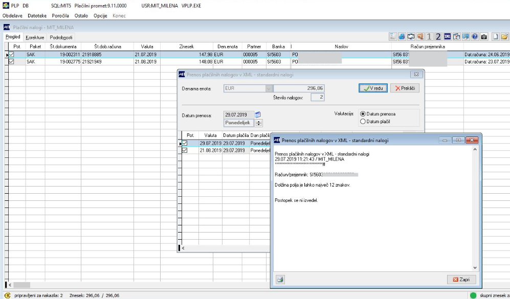 V primeru, da glede na model 00 sklic ni pravilno sestavljen, program zavrne pripravo XML in javi obvestilo: