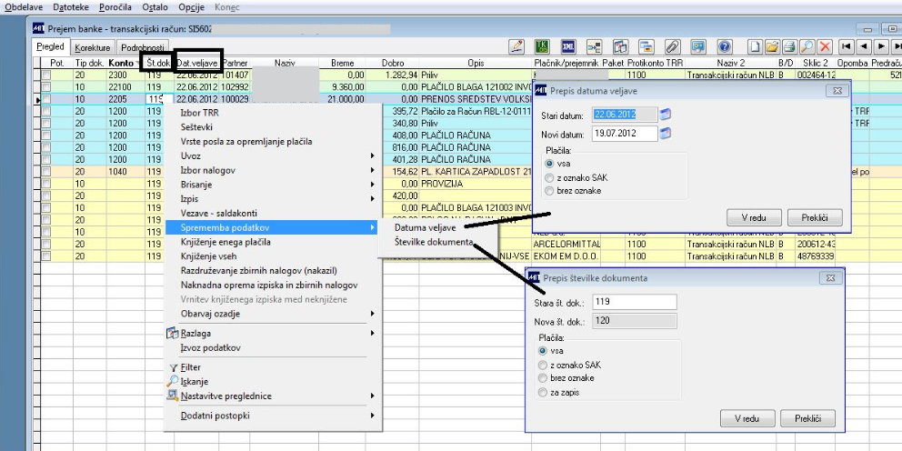 Opcija je namenjena spremembi Datuma veljave izpiska in spremembi številke dokumenta-izpiska, sočasno vsem postavkam.