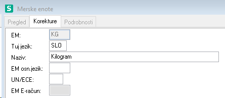 Vnosna polja so:- EM (enota mere), ki je ključni podatek v šifrantu artiklov. Uporabljamo krajšave, ki so splošno v rabi.- Tuj jezik, vpišemo jezik v katerem smo napisali enoto mere. Nazive merskih enot napišemo v več jezikih v primeru, da izdajamo dokumente v več jezikih.- Naziv je polje, kjer vpišemo naziv merske enote