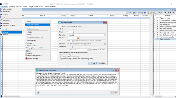 Pred knjiženjem inventure sprožimo še test inventurnih podatkov. Če test javi napake, jih moramo odpraviti pred knjiženjem inventure.