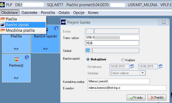 Podatke enega ali več uvoženih izpiskov lahko izpišemo na papir, pdf,... Izpis lahko izvedemo preko desnega menija in opcije Izpis ali pa s posebno ikono. Kontaktno osebo in e-naslov vpišemo na masko ob vstopu v meni za bančne izpiske.