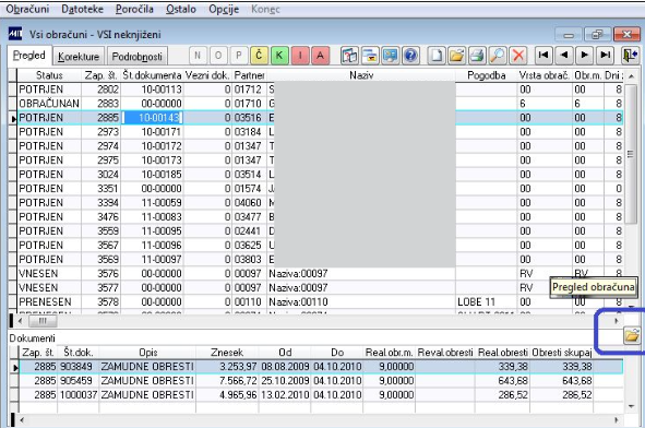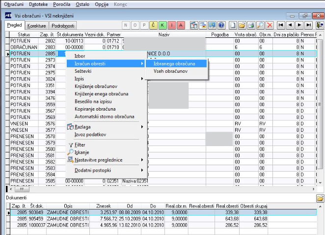Z desnim menijem lahko izračun obresti pripravimo za konkreten dokument ali pa za vse dokumente na izbranem pregledu.