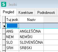V šifrantu Jeziki so shranjeni podatki o jezikih, ki jih uporabljamo za napise na dokumentih. Tuj jezik vnaša oznako tujega jezika npr. ANG, v polje Naziv pa naziv tujega jezika npr. angleški.