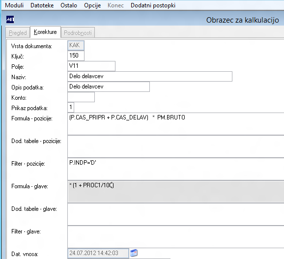Ključi imajo lahko različne kombinacije izračunov. Na spodnji sliki je prikazan izračun dela delavcev po bruto postavki delovnega mesta (Formule - pozicije). Izračun se poveča za odstotek, ki je zapisan in prikazan v predizboru predkalkulacije (Formule - glave) .