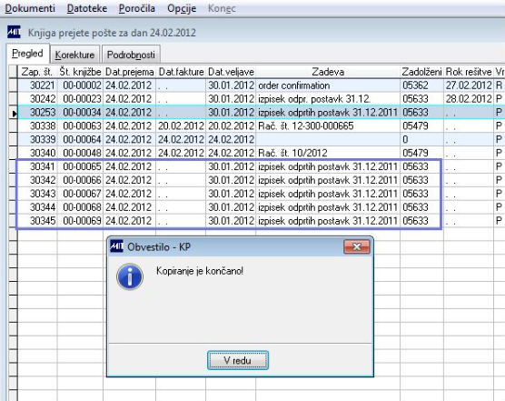 S klikom na zapis določimo kateri zapis bomo kopirali. Program pokaže kateri zapis bomo kopirali in ponudi število kopij 1. Število kopij lahko spremenimo s prepisom. Omejitev je na dva znaka. Izvedbo kopiranja potrdimo s klikom na ikono V redu. Program naredi izbrano število kopiranih zapisov, ki jih lahko po potrebi spremenimo, brišemo. Program povišuje zaporedno številka zapisa za 1. Števec se poviša glede na izbrani datum in ali gre za prejeto/dano pošto.