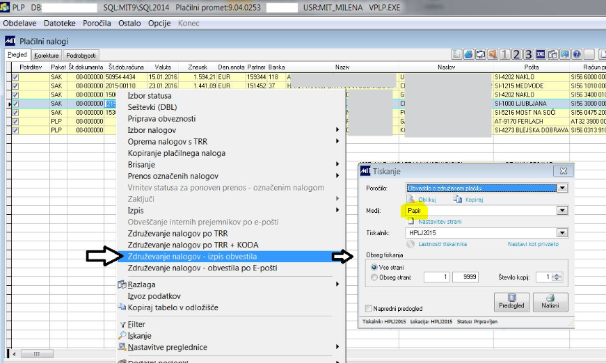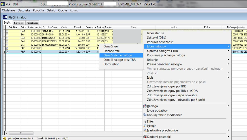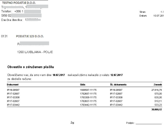 Glede na to, da je partnerja pametno posredovati specifikacijo združenih plačil, lahko naredimo izpis s specifikacijo združenih postavk. Osnovni izpis je PLP_VIRZDR. V sistemsko nastavitev (nivo uporabnika) XZDR_IZP vpišemo izpis, ki se bo upošteval kot osnovni izpis.