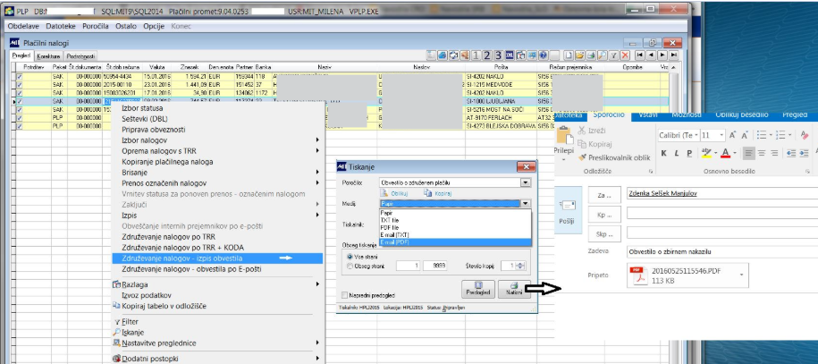 Pri tej možnosti program takoj, brez izbora maske Tiskanje, pripravi e-mail s PDF prilogo specifikacije. V tem primeru program vedno vzame osnovni izpis. Pogoj, da se pripravi mail je, da ima partner v šifrantu kontaktne osebe, vpisan mail kontakta in v polju Seznam paketov vpisan PLP. Če je združenih in označenih več nalogov, bo program pripravil toliko mailov (enega za drugim), kolikor je združenih (in označenih) nalogov.