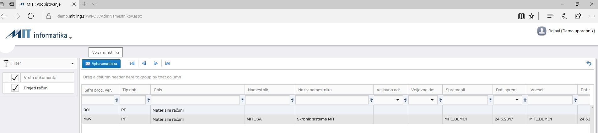 Vmesnik omogoča izbor med administracijo svojih namestnikov in med procesom Podpisovanja. Omogočeno je, da podpisnik sam določi pri posamezni podpisni verigi kdo bo namestnik v kdaj - čas odsotnosti podpisnika. V primeru, da datumsko obdobje od - do pustimo prazno to pomeni, da je namesnik podpisniku brez časovne omejitve.