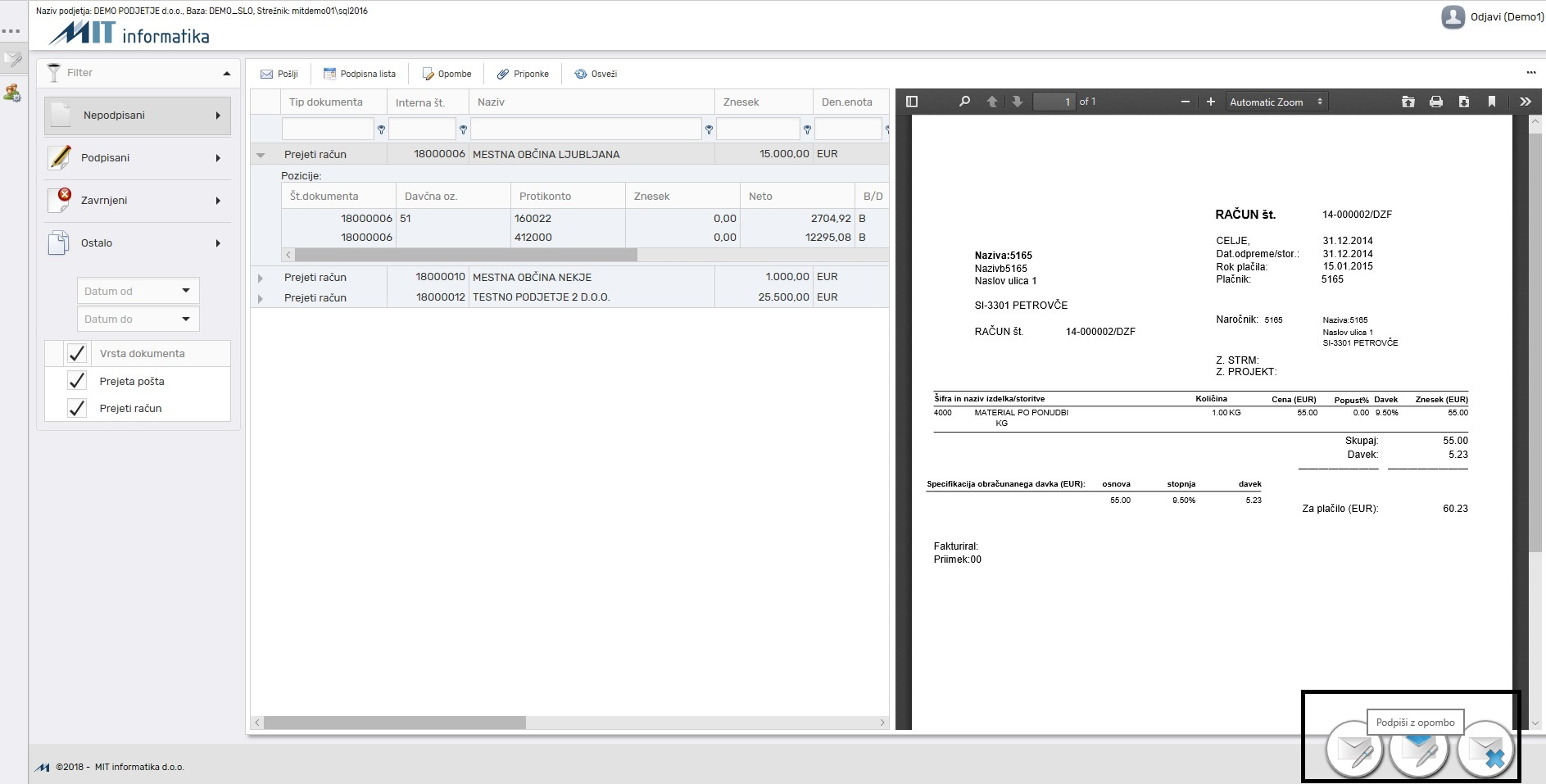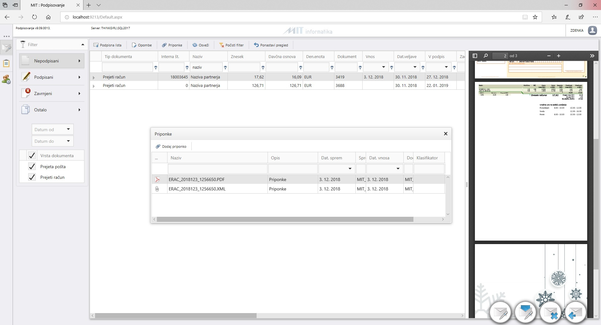 Datoteke, ki niso shranjene v pdf strukturi, bo program odprl v ločenem oknu, če bomo kliknili na znak pred priponko. Od velikosti preglednega okna in monitorja je odvisno ali se bo pdf datoteka odprla desno ali spodaj. Z razširitvijo delovnega okna ima podpisnik vpogled na že vnesene pozicije prejetega računa v sistemu ERP.