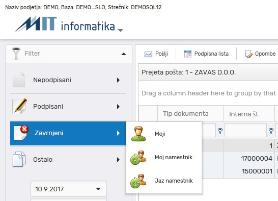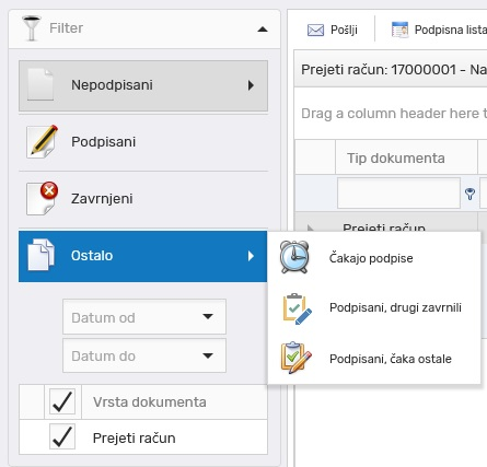 - Ostalo - pregled dokumentov Čakajo podpise (prijavljeni podpisnik še ni na vrsti), Podpisani, drugi zavrnili, Podpisani, čaka ostale