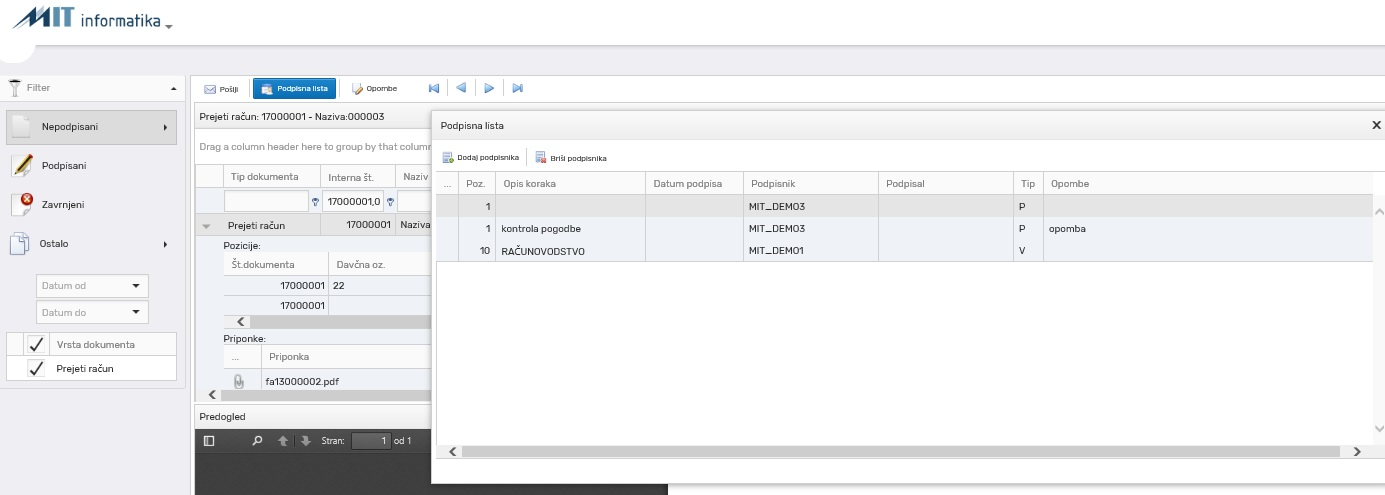Podpisnike dokumenta se določi s podpisno verigo v ERP sistemu. V fazi podpisovanja je omogočeno dodati nov korak in podpisnika z vpisom razloga in naloge novemu podpisniku. Podpisnika, ki je označen, da je opcijski podpisnik (ni obvezno, da dokument podpiše), pa je omogočeno iz dokumenta, ki ga obdelujemo, odstraniti. Poleg datum podpisa je viden tudi Datum v podpis.