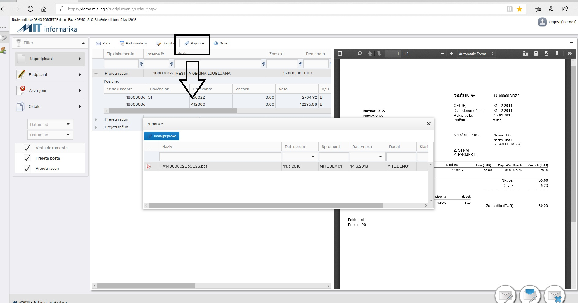 Urejevanje priponk - v oknu Priponke je omogočeno dodajati nove priponke, ki jih program shrani na dokument katerega obdelujemo. Omogočeno je brisanje za tiste priponke, ki jih je prijavljeni podpisnik dodal sam preko spletnega podpisovanje. Priponke se sme brisati dokler ima dokument še status, da ga mora prijavljeni podpisnik podpisati - klic Priponk preko filtra Nepodpisani (podpisnik ali namestnik).