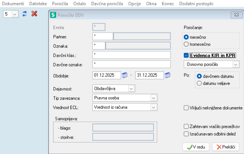 Enota: omejitev na konkretno šifro Enote, * - vse.Partner: omejitev na konkretno šifro partnerja, * - vse.Oznaka: omejitev na konkretno oznako prejete/izdane fakture, * - vse.Davčni klasifikator: omejitev na konkreten davčni klasifikator, * - vse.Možne oblike vnosov omejitve na klasifikator so:- naštetje nizov klasifikatorjev v obliki npr. VSR*, VNR*- omejitev na npr. zadnji znak klasifikatorja v obliki ___E ali _N_D (prejeti računi za promet na domačem trgu ___D, samoobdavčitev za podjetja brez sedeža v Sloveniji ___S, promet v EU ___E, uvoz ___U, samoobdavčitev pri ___T, pavšalisti ___P, računi za nakup osnovnih sredstev O___, nepremičnine N___).Dvojni klik na polju davčni klasifikator pokaže šifrant davčnih klasifikatorjev.Davčne oznake: omejitev na konkretno davčno oznako, * - vse.Obdobje: omejitev obdobja pregleda podatkov. Tip datuma je lahko po: davčnem datumu ali po datumu veljave. Dejavnost: Izbor vrste dejavnosti, označene v šifrantu OznakeTip zavezanca: Določitev tipa davčnega zavezanca, našega podjetja, ki pripravlja XML datoteko. Možne vrednosti so: Pravna oseba, Fizična oseba, samostojni podjetnik.Vrednost ECL: možnost izbora vrednosti zneska iz ECL-a ali iz računa.Poročanje: zbir podatkov po mesecih ali po tromesečju.Evidenca KIR in KPR: Priprava XML datoteke za Evidenco KIR in KPR. Te ni mogoče pripraviti, če so vključeni tudi neknjiženi dokumenti.Samoprijava: izbor pomeni možnost izdelave izpisa in vključitev obveznosti po mesecih v XML obliko obrazca. Seštevek je glede na davčno obdobje in začetek zamude davčnega obdobja.Obresti program ne izračunava. Možen pa je vpis.Vloga za predložitev po roku: Izbor se prikaže na izpisu in v DDV-O datoteki.
