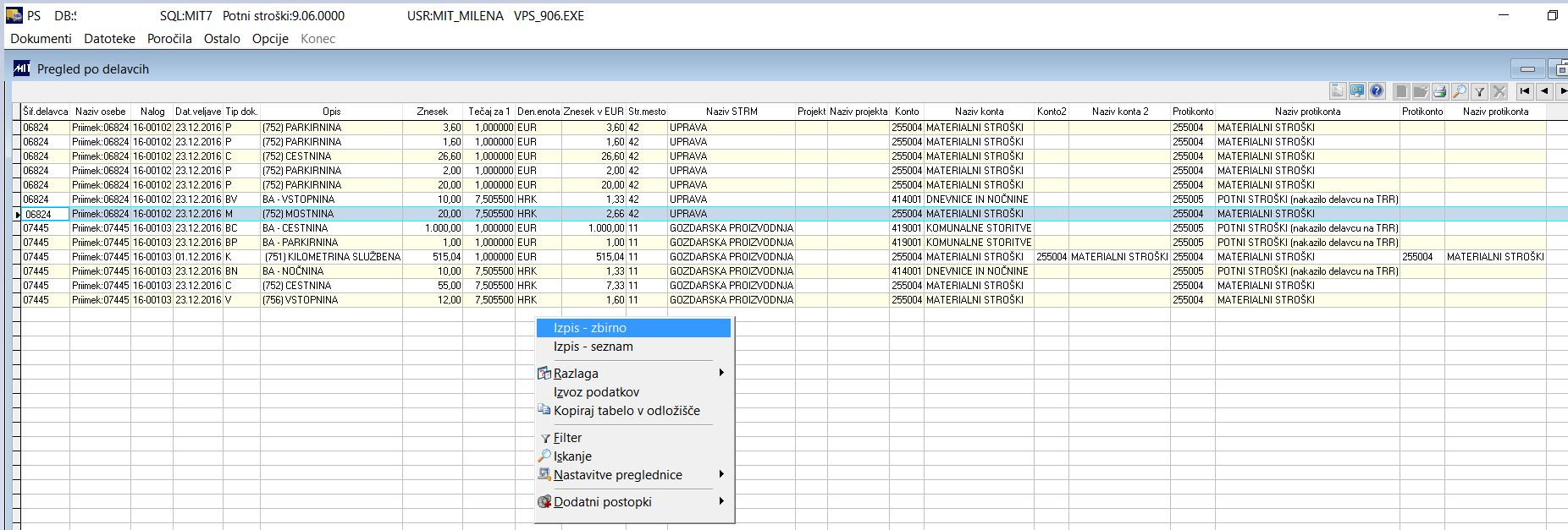 Poročilo nam prikaže podatke na pregled z možnostjo izpisa ali izvoza v datoteko.