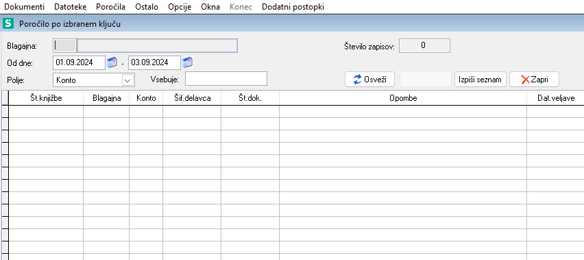 Knjižene dokumente, ki jih želimo vključiti v poročilo, imamo možnost omejiti na pogovornem oknu glede na:- blagajno,- datumsko obdobje od-do,- izbrani ključ (polje).
