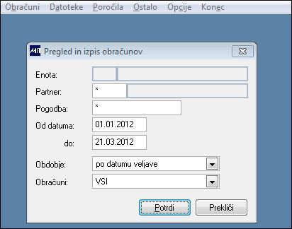 - Partner:Omejitev na partnerja izberemo v primeru, da želimo pripraviti poročilo vseh obračunov v nekem obdobju za konkretnega partnerja. - Pogodba:Omejitev na pogodbo izberemo v primeru, da želimo pripraviti poročilo o vseh obračunih obdobja, ki so bili pripravljeni za konkretno pogodbo.