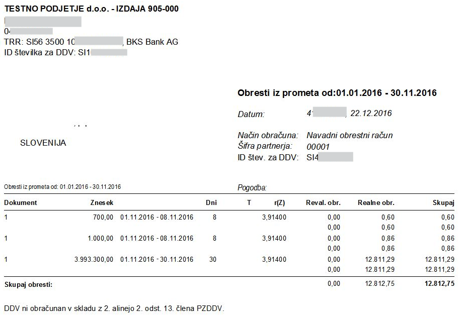 Z desnim menijem lahko izpišemo enega ali vse obračuna, če imamo pripravljene za več partnerjev. V tem primeru je obračun samo informativen. V glavi izpisanega obračuna je drugačen opis kot pri rednem izpisu obračuna. Tu je navedeno, da gre za obračun obresti iz prometa.
