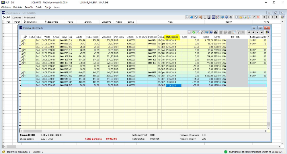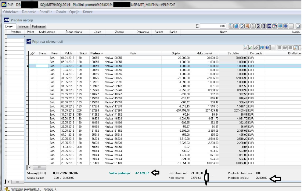 Pomen oznake !- Klicaj se pojavi pri tistih postavkah, katerih so bili zneski samo delno plačani, primer: Skupni znesek obveznosti je 2.800 EUR, plačamo samo 2.000 EUR, ostane za plačilo še 800 EUR.- Klicaj se pri pripravi obveznosti pripravi pri tistih postavkah, ki so že bile uvožene z izpiskom, izpisek je že bil knjižen, niso pa še prenesene v saldakonte.- Klicaj se pri pripravi obveznosti pripravi pri tistih plačilih, ki so že bila prenesena v saldakonte, plačila so tudi že knjižena na saldakontih, niso pa še zaprta s fakturo.