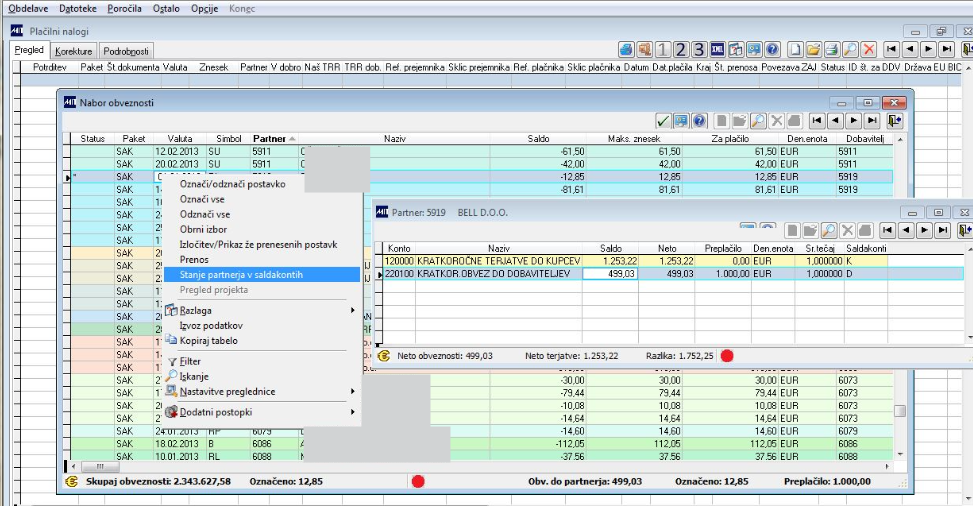 Z opcijo desnega menija lahko izvedemo pregled Stanja partnerja v saldakontih.