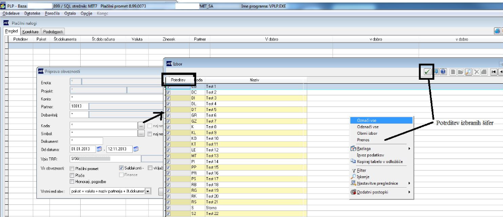 Izbor podatka o Kodi in Simbolu:Poleg polja se nahaja posebna ikona, s katero lahko dostopamo do posameznega šifranta. Po potrditvi ikone se nam odpre torej šifrant (enako velja, če dvakrat kliknemo v polje Koda ali Simbol) ter na pregledu šifranta z opcijami desnega klika izberemo eno ali več šifer.- Dokument: omejimo se lahko na konkreten dokument (polje STDOK v saldakontih). Polje Številka dokumenta ima zapise internih številk prejetih računov, to niso dobaviteljeve številke računov.- Od datuma: gre za najnižji datum zapadlosti, polje Valuta, program vedno ponudi 1.1. tekočega leta. Datum Do je maksimalni datum Valute.- Vpis TRR: glede na šifrant Transakcijski računi izberemo najpogostejši transakcijski račun, torej TRR, iz katerega bomo poravnali obveznosti. Po izvedeni pripravi plačil iz saldakontov, financ in plačilnega prometa bo tem postavkam program avtomatsko vpisal izbrani TRR. Plačila iz plač in honorarjev obdržijo transakcijski račun, ki je bil izbran v teh programskih modulih ob generiranju plačilnih nalogov.