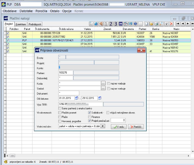 - Samo partnerji z enako banko: Na pregled obveznosti za plačilo program pokaže samo tiste partnerje (ali dokumente izbranega partnerja), ki imajo v glavi prejetega računa vpisano enako banko, kot je navedeno v prvih 6 mestih TRR podjetja.- Vir obveznosti: izberemo poljubne programske module, iz katerih želimo pripraviti plačilne naloge. Vir obveznosti izberemo iz naslednjih programskih modulov: - Plačilnega prometa (za naprej pripravljene plačilne naloge v plačilnem prometu), - Plače (v programu Plače kreirani plačilni nalogi), - Honorarji, pogodbe (v program Honorarji kreirani plačilni nalogi), - Saldakonti (obveznosti knjižene v saldakontih oziroma so še na statusu neknjiženi v saldakontih, če izberemo opcijo "vključi neknjižene obvez."), - Finance (obveznosti pripravljene za plačilo v programu Finančno poslovanje). - Prejeti predračuni: povezava z modulom Nabava / Prejeti predračuni.- Vrstni red obveznosti:Vrstni red pregleda obveznosti je postavljen v tri izbore.