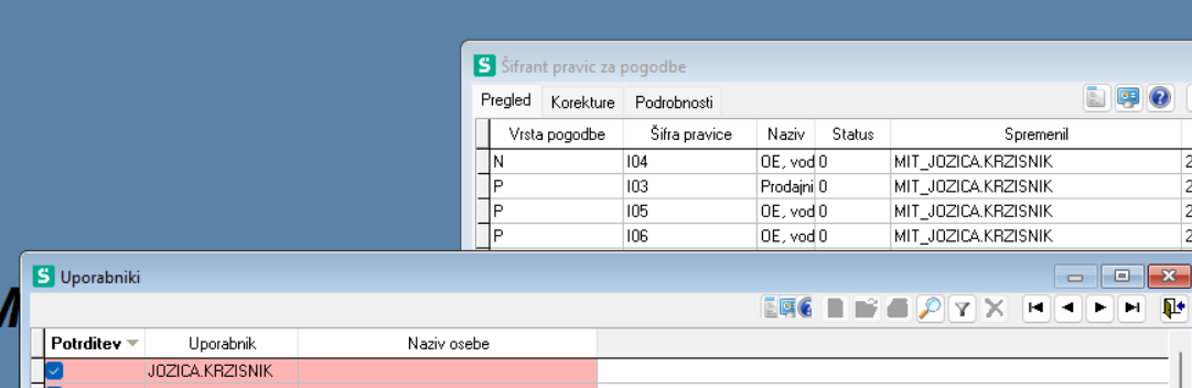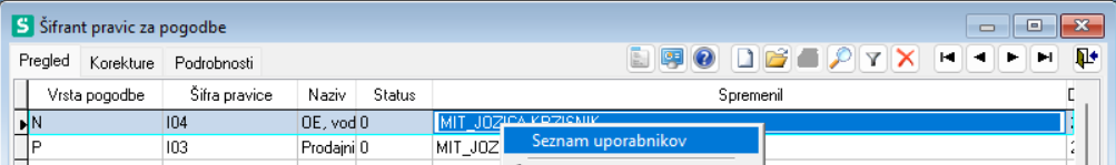 Izbrani uporabniki se vidijo v spodnjem oknu seznam šifer pravic za pogodbe.
