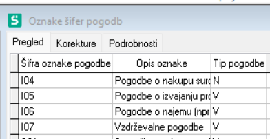 Najprej vnesemo šifre s poljubno šifro v šifrant Oznake šifer pogodb. Tu poleg opisa dodamo še tip pogodbe (V - projektne pogodbe, N - nabavne pogodbe, P - prodajne pogodbe).