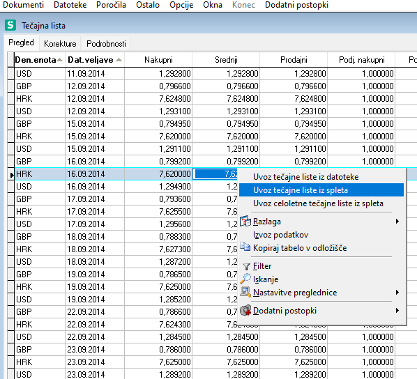 Tečajnico objavljeno na spletu Banke Slovenije, uvažamo preko opcije desnega menija. Izbiramo med možnostmi uvoza: