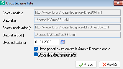 - Uvoz tečajne liste BS iz WWW (XML) - to je uvoz podatkov iz spletne strani Banke Slovenije;