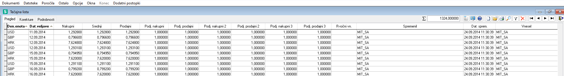 Podatki iz šifranta tečajna lista sistem uporablja pri deviznih obdelavah (npr. obračun tečajnih razlik, preračun po izbranem tečaju...). Omogoča vodenje deviznih tečajev za poljubno število tujih denarnih enot.