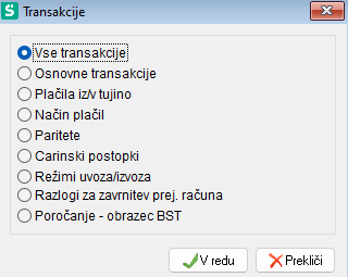 - Transakcija: šifra transakcije, plačila, paritete, carinskega postopka, režima uvoza/izvoza