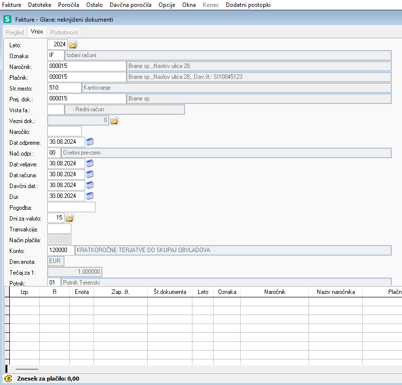 - Leto: leto za katerega vnašamo dokument, program avtomatsko vpiše tekoče leto
