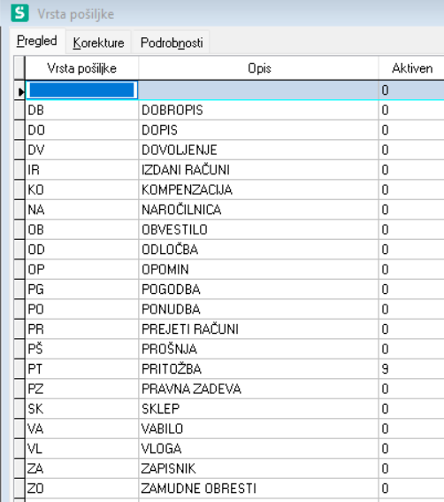 V šifrantu Vrsta pošiljke nam je omogočeno Vrste pošiljke, ki jih ne uporabljamo več dodelit na status 9 (Splošna blokada) v polju Aktiven. Program pri vnosu pošte Vrst pošiljke z statusom aktivnosti 9 ne ponudi na izbor.