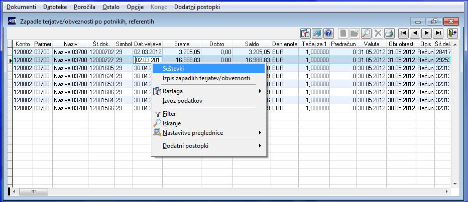 Poročilo omogoča analizo zapadlih terjatev in obveznosti po potnikih ali referentih na določen dan. Podatke lahko pregledujemo ali izpišemo. Po potrditvi menija pripravimo podatke z nastavitvijo pogojev pregleda. - Enota: organizacijska enota (opcija); - Str. mesto: stroškovno mesto (opcija); - Konti: naštejemo lahko konte odprtih postavk; - Simbol: šifra simbola; - Partner: šifra partnerja; - Potnik: šifra potnika; - Referent: referenta; - Do datuma: datum valute, do katere se upoštevajo zapadle terjatve - obveznosti; - Trenutni NETO saldo: odpre se samo v primeru, ko imamo polje Do datuma naveden tekoči dan. Je poseben stolpec s podatkom, kjer je Saldo odštet za rezervacije, zadržana sredstva, plačila v teku, torej vsa plačila, ki so še v obdelavi. V primeru, da na izboru potrdimo opcijo Trenutni NETO saldo, na predogled dobimo še štiri nova polja: * Asignacije - upošteva se znesek rezerviran v opciji Asignacije, cesije * Rezervirano - upošteva se znesek iz opcije Rezervacije - začasne knjižbe (kompenzacije) * Plačano - upošteva se znesek že pripravljenega plačilnega naloga * Znesek zadržanih sredstev - upošteva se znesek iz opcije Zadržana sredstva